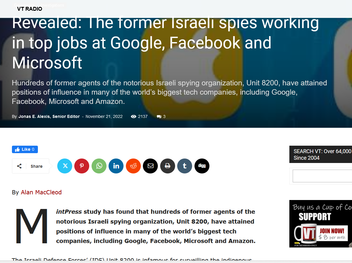 Revealed Former Israeli Spies Working in Top Jobs Google, Facebook and Microsoft (31st August 2022) Mint Press (and Veterans Today)