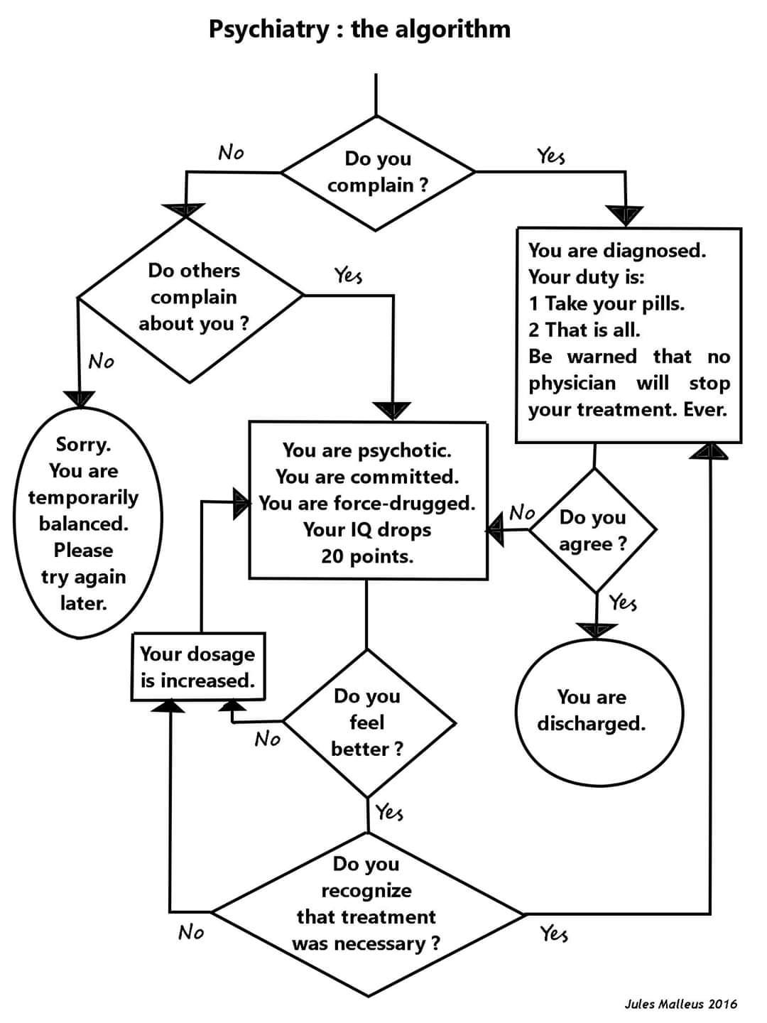 In Australia if someone were to reveal to a psychiatrist that they had ESP or anything religious to do with Jesus then this algorithm frequently kicks in. This could be because having said abilities have the potential to be a threat to national security, as seen with the Scottish clairvoyant Helen Duncan during WWII, but also many psychiatrists in Australia today are not Christian. I did not meet a Christian psychiatrist in my years working as a mental health clinician. I even witnessed a grieving adolescent being diagnosed with schizophrenia and drugged until she exhibited extrapyramidal side effects because she had a lucid dream about her recently deceased father and interpreted that as a visitation. Unfortunately she revealed her dream to the wrong person.