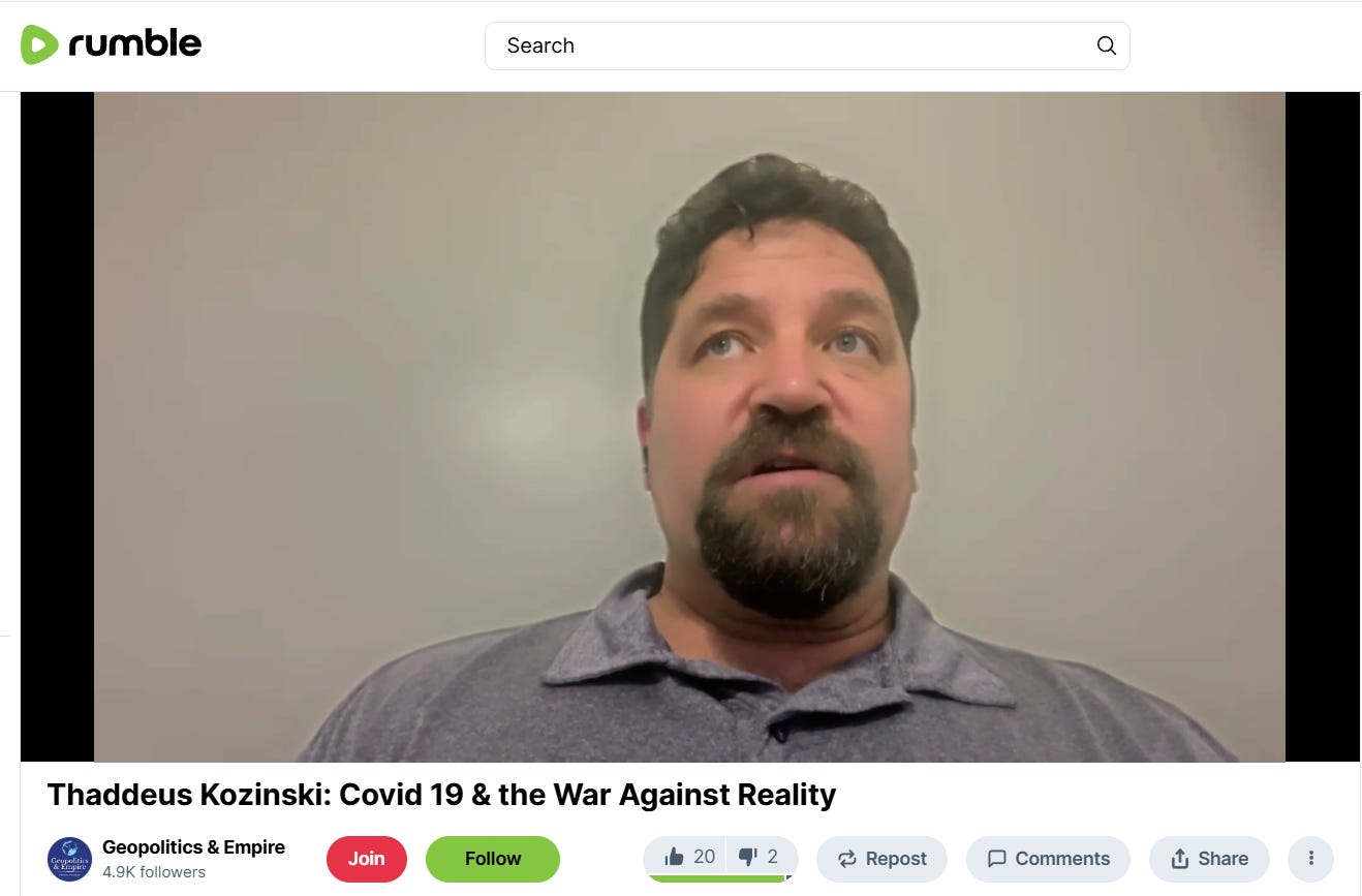 https://rumble.com/v6spn4r-thaddeus-kozinski-covid-19-and-the-war-against-reality.html