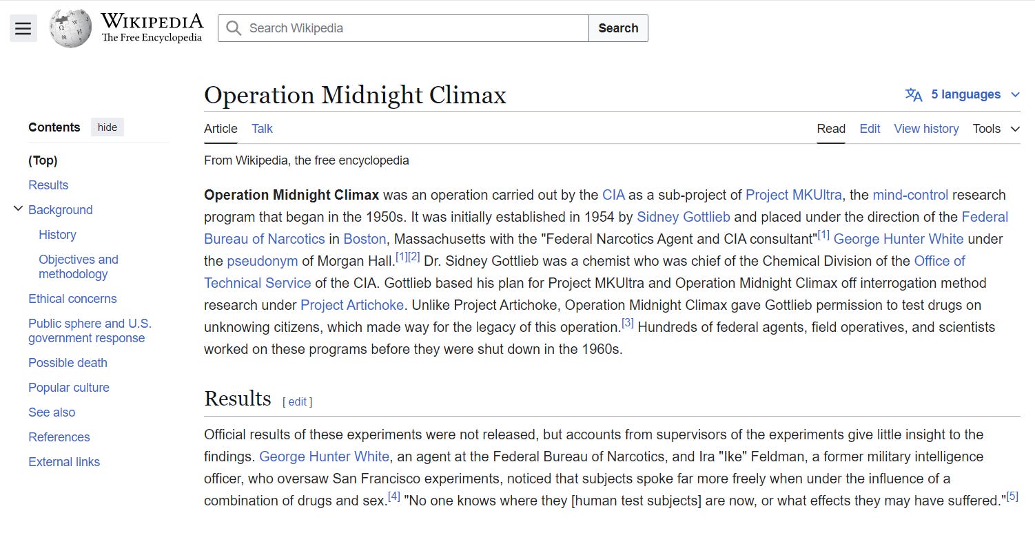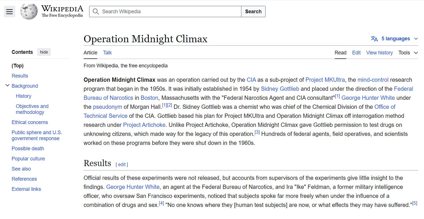 Operation Midnight Climax was a drug infused CIA mind control operation that exploited innocent unsuspecting civilians.