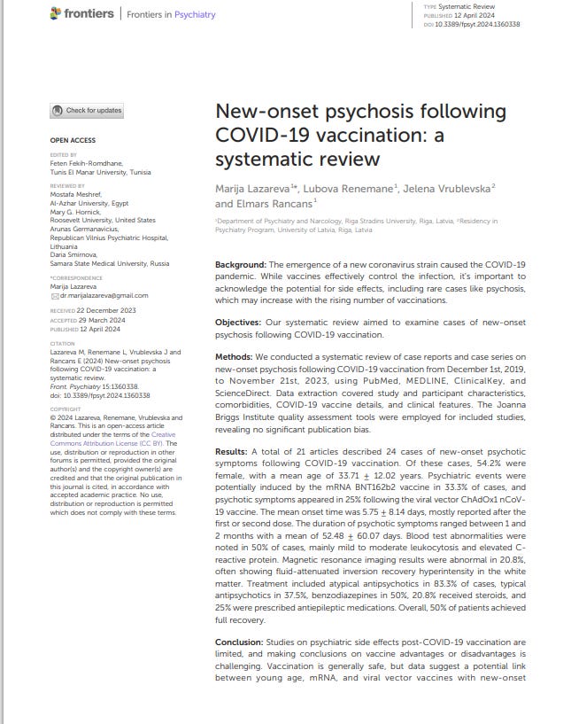 New-onset psychosis following COVID-19 vaccination: a systematic review (April 2024) Marija Lazareva, Lubova Renemane, Jelena Vrublevska, Elmars Rancans