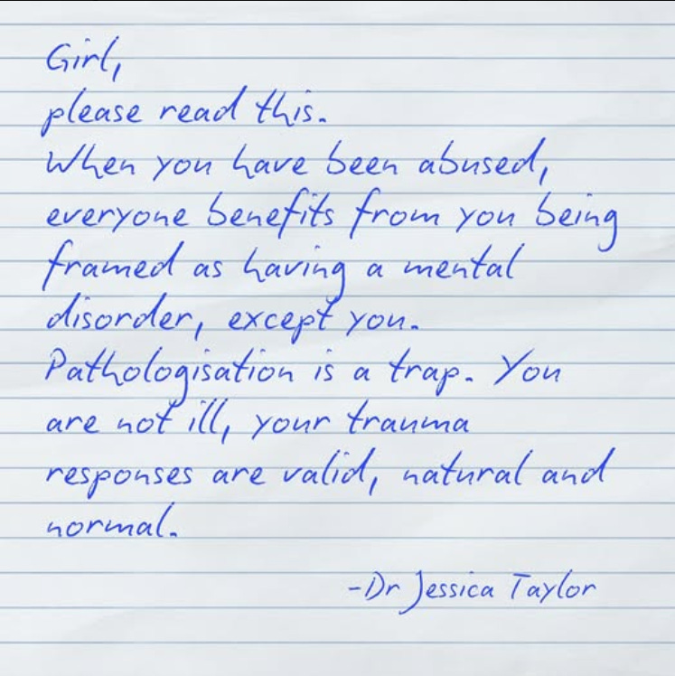 "Women and girls don’t benefit from this system of pathologising them, but everyone else does. Everyone. Systems. Families. The abuser. Governments. Professionals. Employers. Partners."