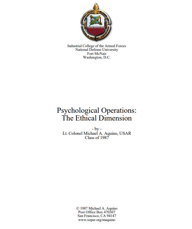 Psychological Operations: The Ethical Dimension - by - Lt. Colonel Michael A. Aquino, USAR Class of 1987. 26 pages.