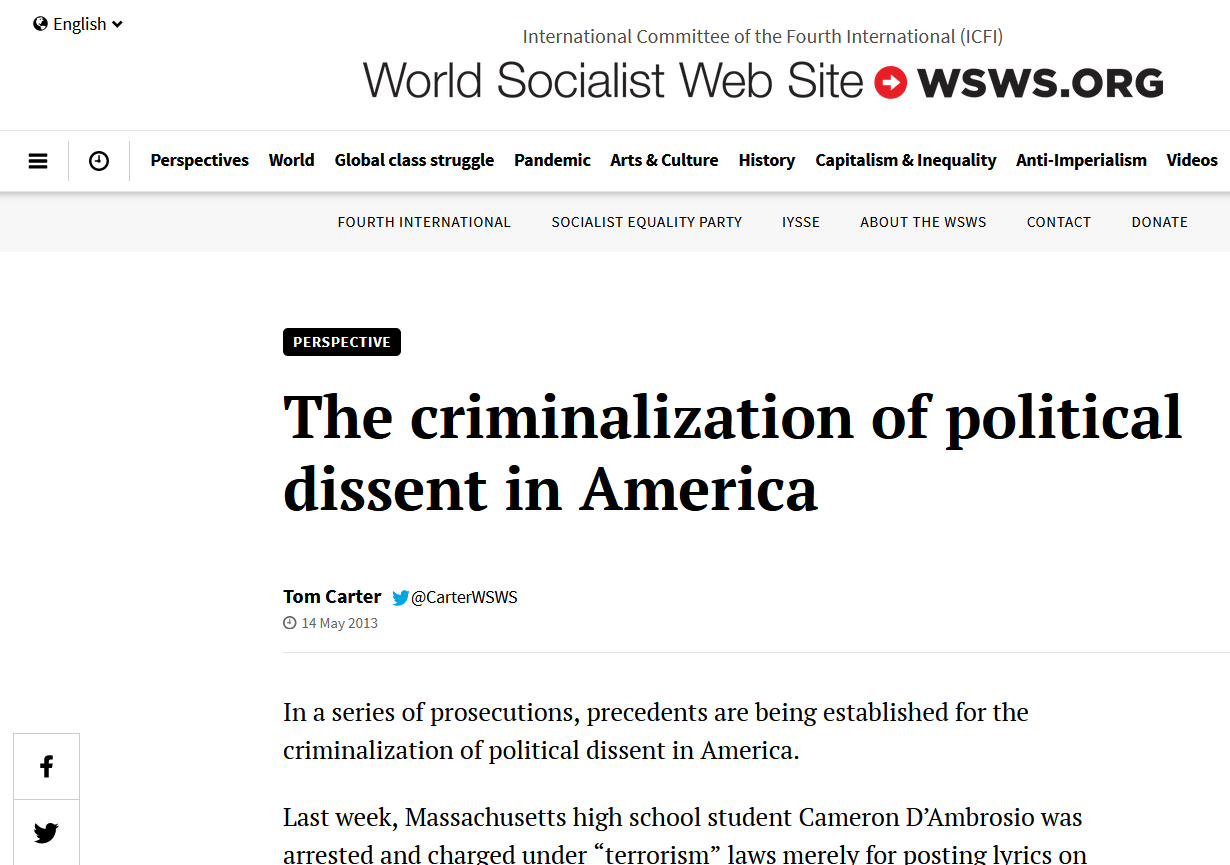 The criminalization of political dissent in America. (14th May 2013). World Socialist Web Site.